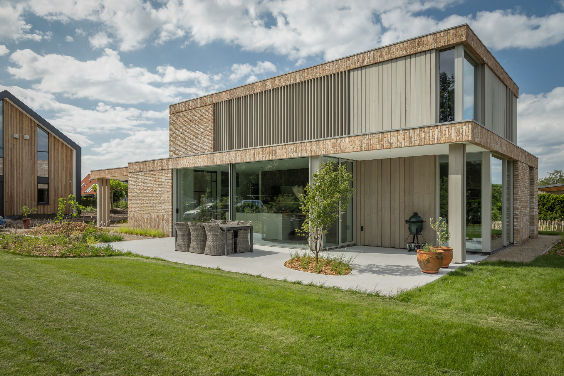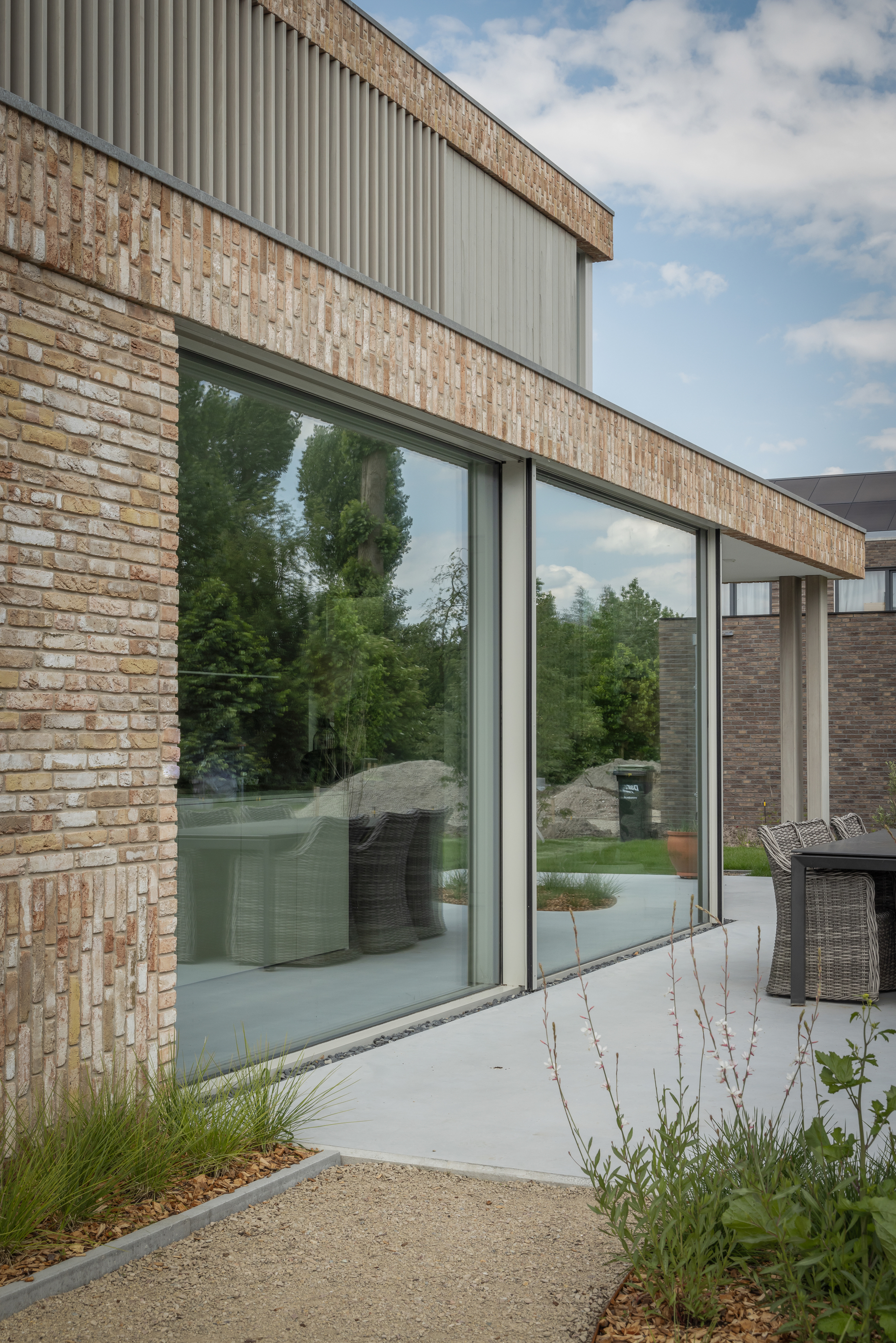 Voor deze villa kozen we bewust voor aluminium schuifpuien met een zo minimaal mogelijk profiel. Hierdoor wordt het buitenleven letterlijk onderdeel van het interieur en verdwijnen de kozijnen grotendeels uit het zicht.